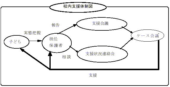 「支援推進委員会」は,特別な配慮を要する子どもを全職員で支援していく時,中心になって活動する組織です。「支援会議」や「支援状況連絡会」を開いたり,必要に応じて「ケース会議」を開いたり,専門機関と連携を図ったりします。 |