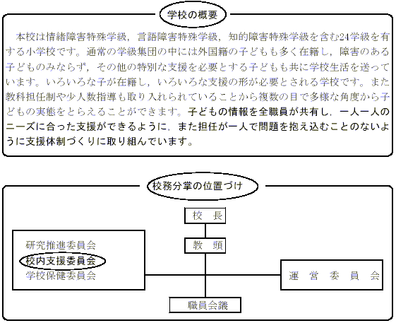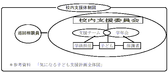 校内支援委員会の小委員会的な実践チームの必要性が考えられ,支援チームを立ち上げ,校内支援委員会開催の準備,子ども支援についての検討(ケース会議)及び実践と同時に通常学級担任,保護者への支援も行ってきました。 |