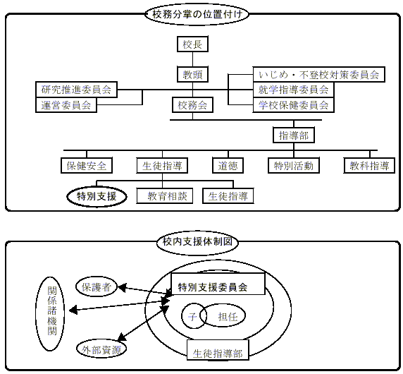 | ○ | 特別支援委員会の大きな役割として,子どもの支援を第一に考え,動きやすい委員会にしたいという考えから組織を小規模にしました。校長,教頭には,話し合いの結果や支援の経過等を報告し,それに対してのアドバイスを受けながら,支援方針の検討を行い,役割分担にそってそれぞれの立場で支援を行うことができたことは効果的でした。 | ||||||||||||||||||||||||||||||||