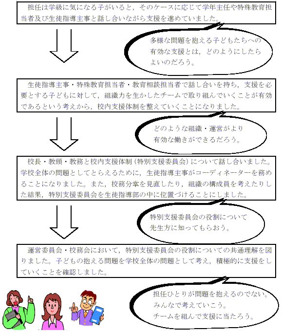 | ○ | 本校では,障害のあるなしに関わらず,学級の中にいる気になる子について話し合いをし,その結果によって支援をしていくことにしました。そのためには,学校全体の問題としてとらえることが大切になってきます。そこで生徒指導主事がコーディネーターとなり,話し合いや支援の段取りを進めることにしました。 | ||||||||||||||||||||||||||||||||