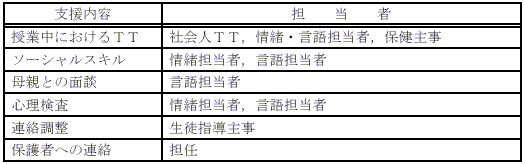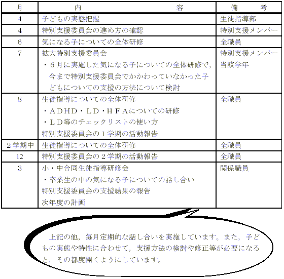 | 1 | 月に一度定期的に話し合いをもちます。また,学級担任や保護者の要望に応じて随時特別支援委員会を開くようにします。 | ||||||||||||||||||||||||||||||||